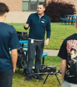 Before taking the controls, James helped design the class syllabus, advised on grants for new drone equipment, and built a curriculum grounded in real industry practice. During a four-hour session, he guided about a dozen engaged students through the resources and knowledge needed to navigate the drone industry, beyond the basic FAA Part 107 requirements. He emphasized that while anyone can buy a drone, turning it into a professional tool and a viable career requires intentional planning and strategy.