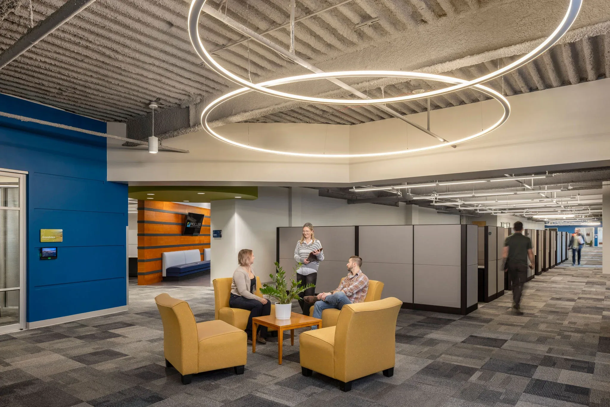 To create a more open and collaborative environment, walls were removed and the client’s existing furniture and flooring were reused for a cost-effective and sustainable approach. Large circular pendant light fixtures were incorporated throughout the space, adding modern design elements and visual consistency.
