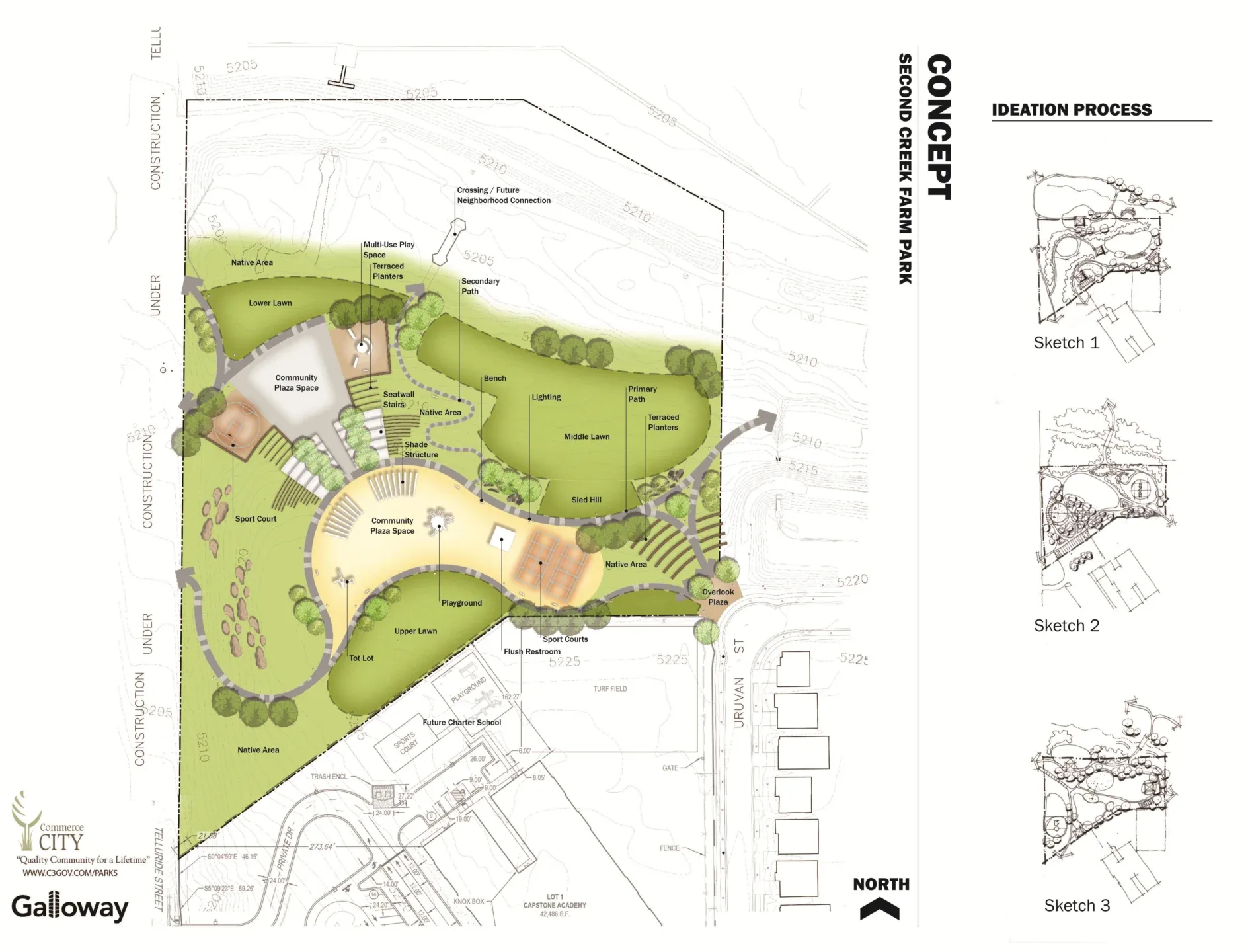 Galloway was selected by the City of Commerce City to provide an overall master plan and construction documents for Second Creek Farm Park, located near 90th Avenue and Telluride Street and adjacent to a future elementary school. Design goals and priorities for this 10-acre site include: